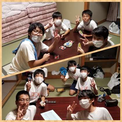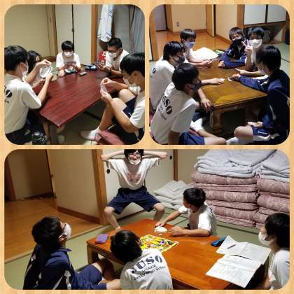 破損調査や緊急避難経路の確認、健康観察を済ませた後は、お風呂の前後自由時間、各部屋ではカードゲームを楽しんでいました。