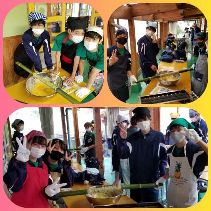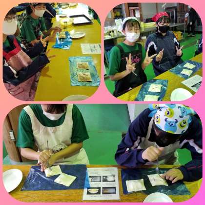 アップルパイとバームクーヘンづくりを準備する生徒たち。