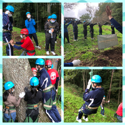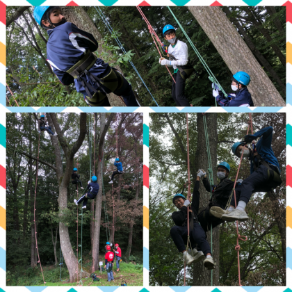 ロープを使い、高さ10mをこえる枝まで登っていきます。