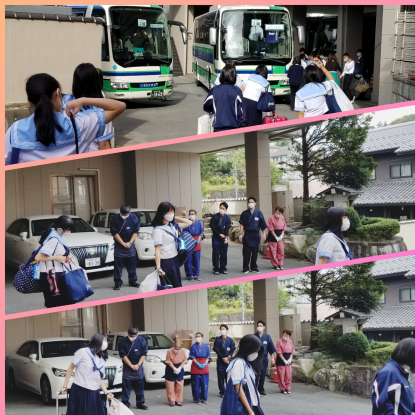 途中、飯田運動公園へ立ち寄り、学年写真撮影、内津峠SAでトイレ休憩等を経て現地へ入ります。