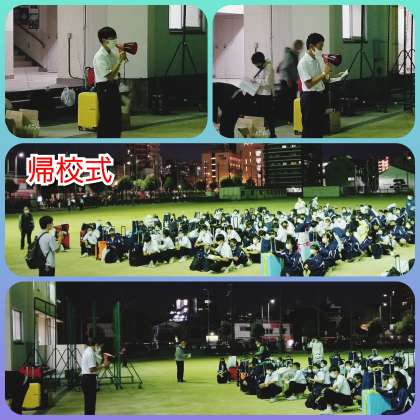夜間照明点灯の中での帰校式。