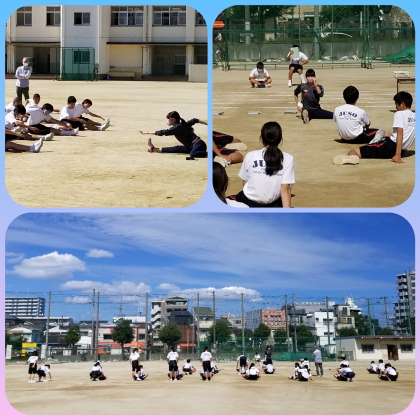 生徒の前で号令をかけホームと股関節の柔軟性を高めます。