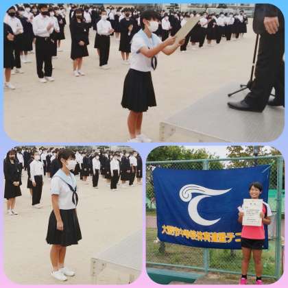 全校集会で秋季総体と大阪市総合文化祭出展作品、そしてジュニアオリンピックの表彰伝達を行いました。
