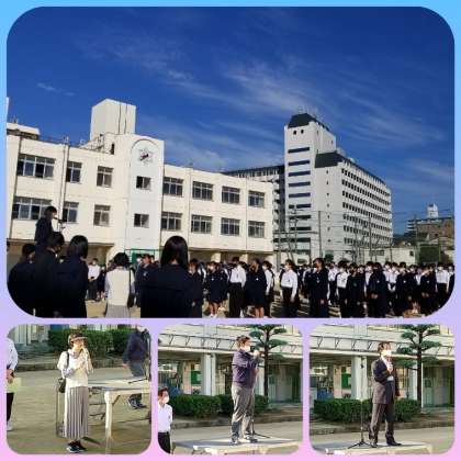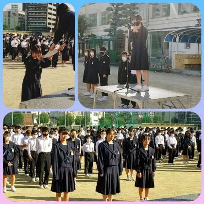 快晴、天高く馬肥ゆる秋です。空は澄み渡って気持ちの良い朝、全校集会を行いました。