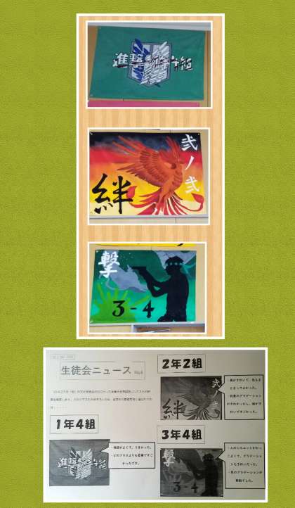 23日(金)文化発表会で体育大会応援旗に展示とその審査が行われました。