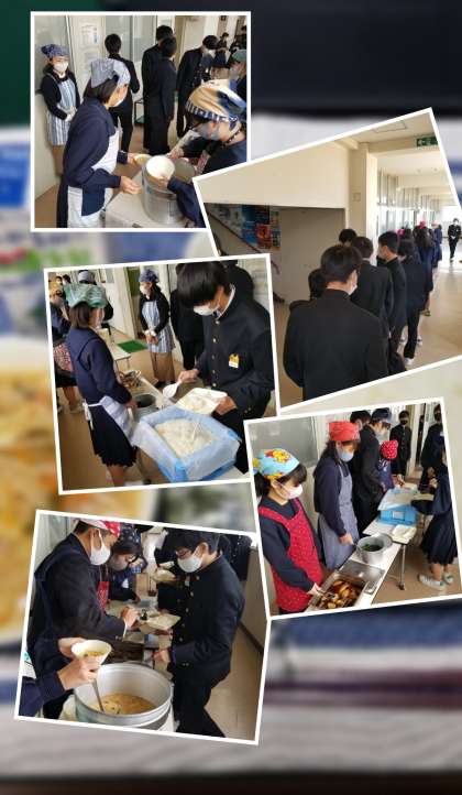 三年生、給食準備で整然と廊下に並び食事に向かいます。