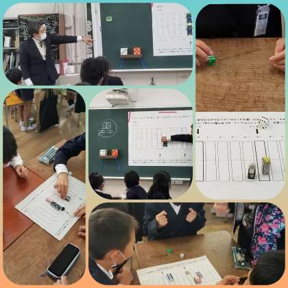 算数ではサイコロを使ったゲームに取り組みます。白サイコロは出た数だけ前へ進み、赤はその数だけ下がります。