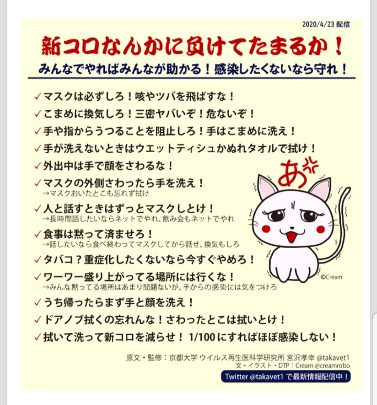ウイルス共進化分野 准教授の宮沢孝幸先生のツイッターがたいへん分かりやすく、実践しやすかったので、引用しました。