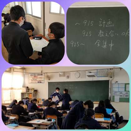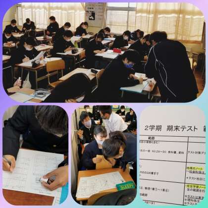 平行して、学級ではテスト勉強をそれぞれのスタイルで行っています。分からないところは友だちに聞くもよし、困っている友だちがいれば、教えてあげるもよし。教室内では教え合い・聞き合いが行われいました。