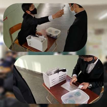 教卓では係生徒が健康観察カードを回収し整理しています。