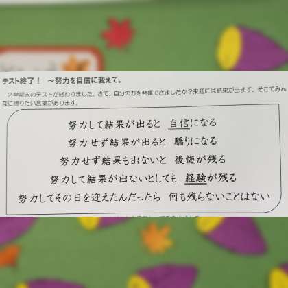 二年生の学級通信に『努力を自信に変えて』という言葉が目に留まりました。