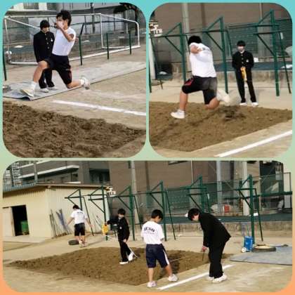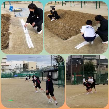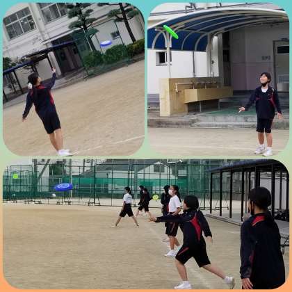 一年生体育では、男子が走り幅跳び、女子がフリスビー投げを行っていました。