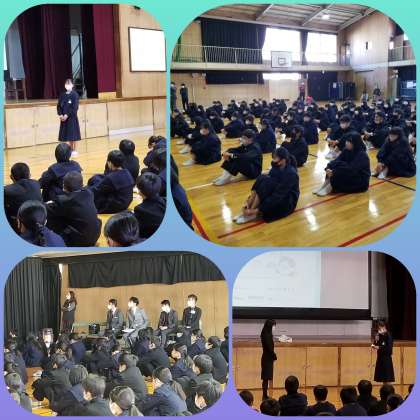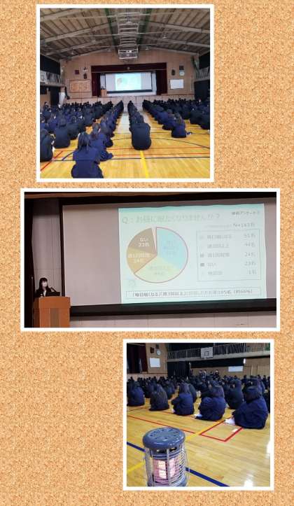 体育館に集まった一年生を対象に、健やかな学校生活を送るための方法を教えていただきました。