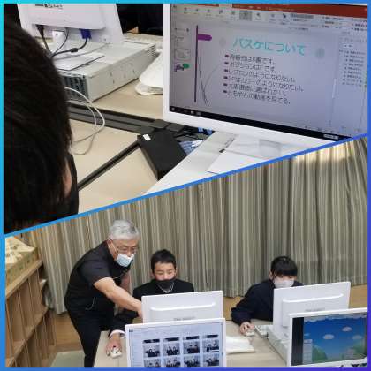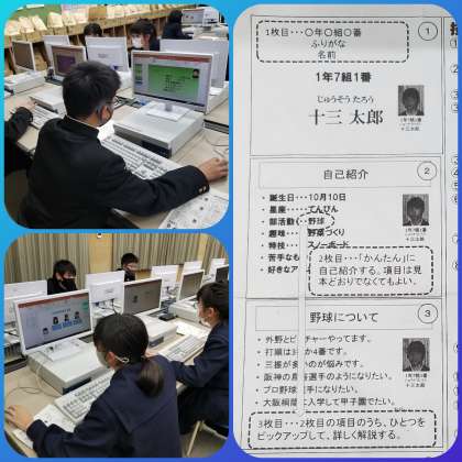一年生パソコン授業では、パワーポイントを使って自己紹介資料を作成しています。