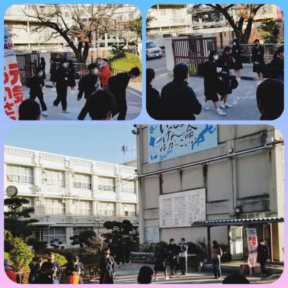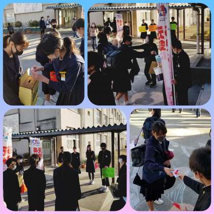 今週は寒い朝が続きますが、『あいさつ運動』が熱心に行われています。今日は三組です。