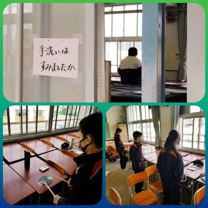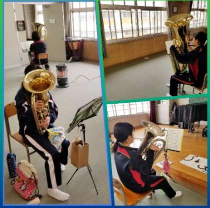 吹奏楽部が換気された部屋で、暖を確保しながらそれぞれがパート練習に励んでいました。