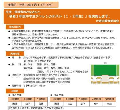 1年生については、国語・数学・英語と『大阪市版チャレンジテストPlus』の理科と社会が加わり5教科によるテストを実施します。