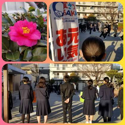 今朝は三組が寒さに負けずあいさつをしています。