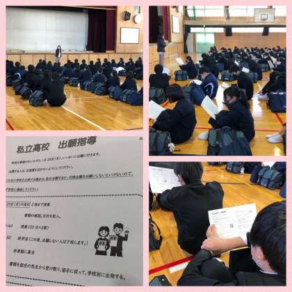 本日、3年生は私立高校出願事前指導を行いました。月曜日に出願を行う生徒が体育館に集合し、説明を聞きました。