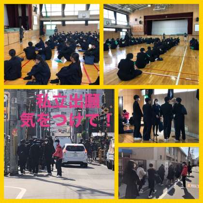 2限の授業終了後、終学活を行い、体育館へ。本日出願を行わない生徒はそのまま下校です。出願に臨む生徒は、体育館の中で最終確認を行い、それぞれの学校へ出発していきました。