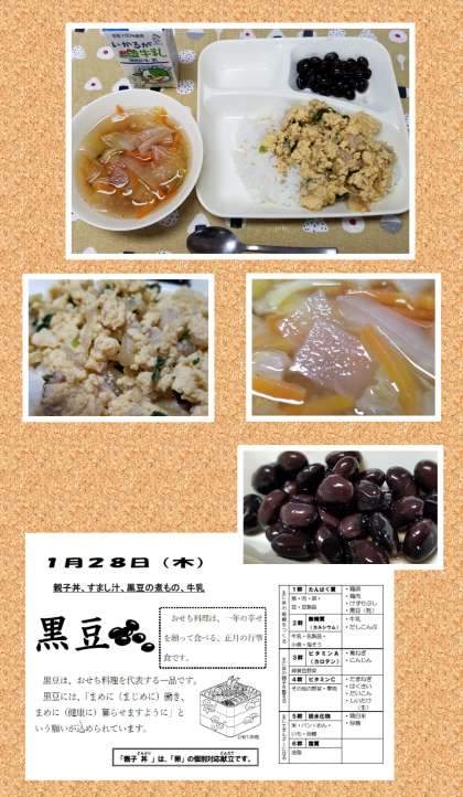 親子丼の狭いスペースで存在感を示す黒豆です。