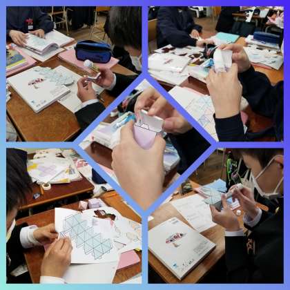想像力を補うために、教科書の付録からミシン目の入った図形を切り取り、実際に立体を組み立てていきます。