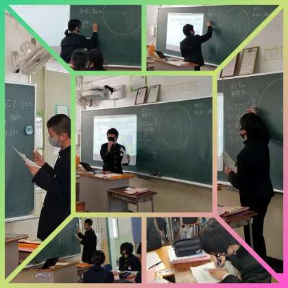 仲間で問題に取りかかり、聞きあい学びあいが起こります。たくさんの生徒が前で黒板に自身の解答を説明しています。