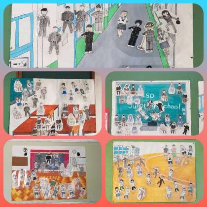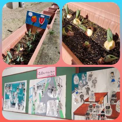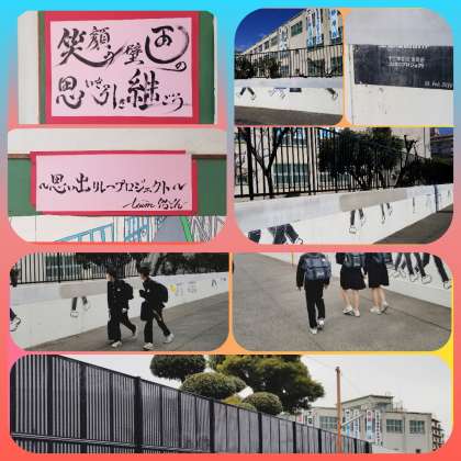 南館一年校舎の掲示板には、『笑顔の壁画の思いを引き継ごう』と通学路の外壁に思いを寄せて、自分流イラストを描き、切り抜いたものを張り付け感謝を表現していました。