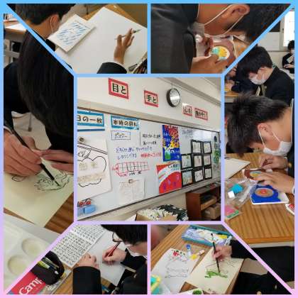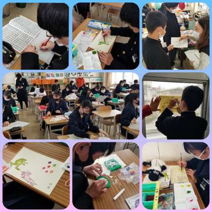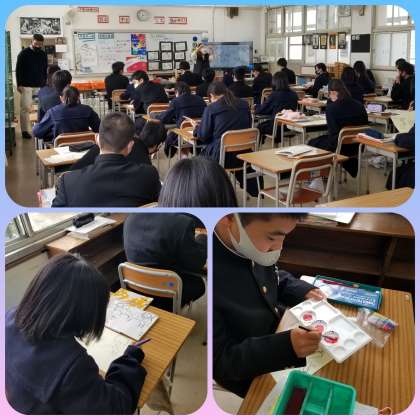 二年生美術授業も大詰め、三組では残すところこの日を入れて二回となりました。