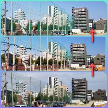 緑色のネットが、中央の白いマンションの屋上を越えている写真から、今回のかさ上げ工事によって高くなった様子が見てとれます。