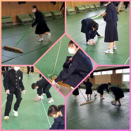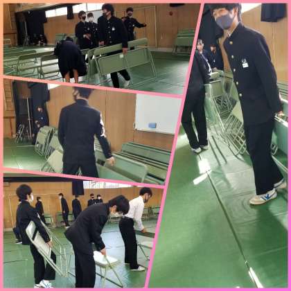 二年生は体育館の清掃とシート敷きから椅子の設置、紅白幕など式場の設営を行います。