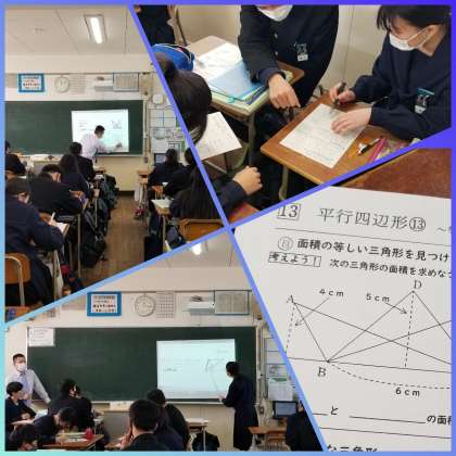 二年生数学では、等積変形について学んでいます。図形の面積を変えずに形を変える。今日は平行線と三角形の性質を利用した学習です。