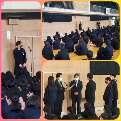 生徒をはじめ保護者の皆さまのご理解とご協力のもと、最終日に1、2年生が体育館に集まりこの日を迎えられたことに改めて感謝申しあげます。