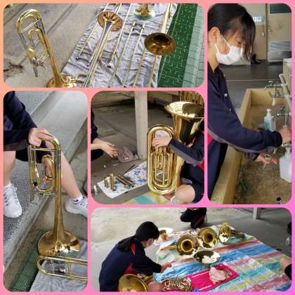 生徒たちはというと、吹奏楽部では新入生用に楽器の洗浄を丁寧に行っていました。
