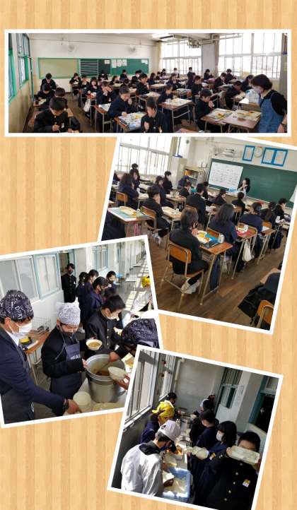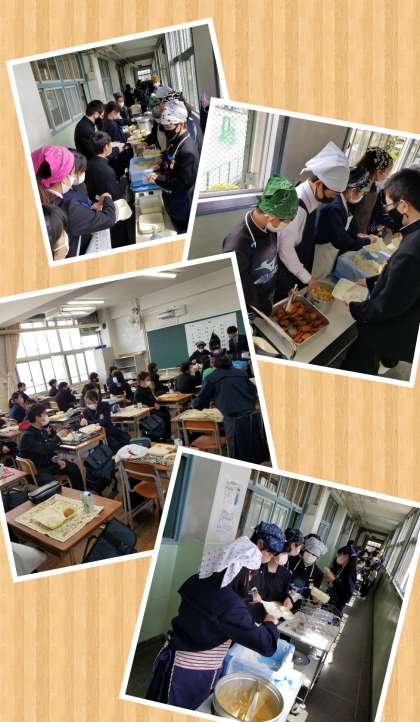 写真は中学校一年生の配膳の様子です。係生徒が盛り付けいます。慣れたものですね。