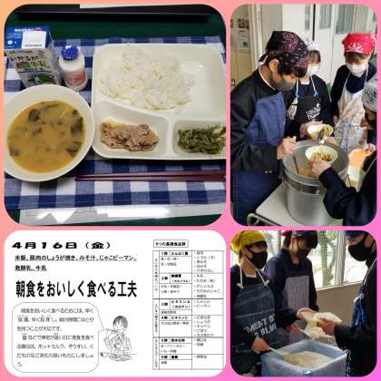 係生徒がご飯をほぐし準備したり、おかずの量を確認したりします。今日の副食は豚肉のしょうが焼き。良い香りが漂ってきます。