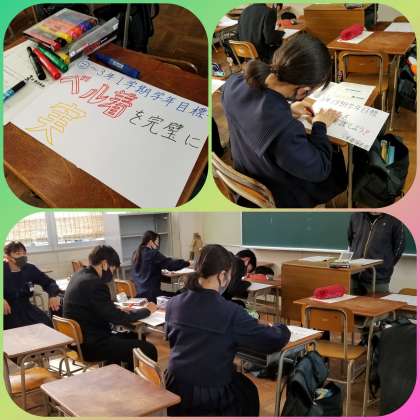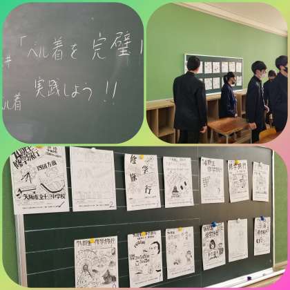 三年生の委員長会では、学年目標『ベル着を完璧に実践しよう』に決定。掲示用ポスターづくりをしていました。