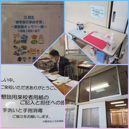 三年生懇談会が実施されている西館校舎では、感染症対策として、大きくあけられた窓、手指消毒用のアルコール、健康チェック表、アクリルパーティションなどが施されています。