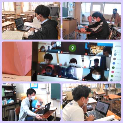 午後15:30から、家庭でパソコンをつないで行う接続テストを1年生と3年生で実施しました。担任の先生方がパソコンの前で待っていると、接続ができた生徒が続々とログインしてきました。