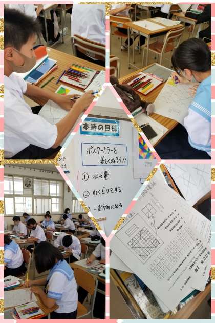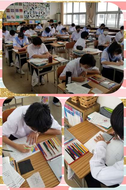 一年生美術では、単位形をもとにした構成で配色を決め、16マス全体のグラデーションを考えていきます。