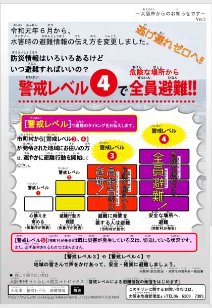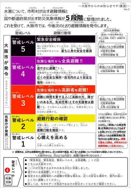 なお、河川氾濫に伴う臨時休業等については、気象庁等から出される防災気象情報(警戒レベル〇相当情報)ではなく、大阪市(大阪市長)が発令する避難情報に基づき、ご判断くださいますようお願いします。