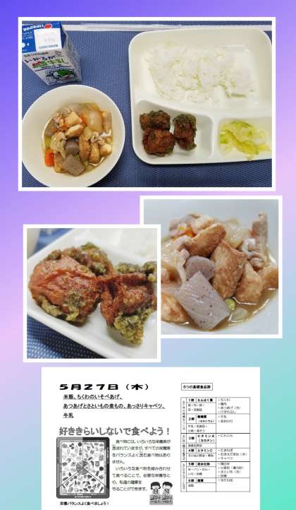 給食の定番『いそべあげ』を本日いただきました。昔から変わらない味に当時の給食の学級や友だちを思い出します。