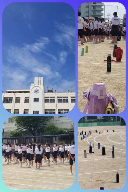 運動場には、学級こどに区切られたスペースに水筒を置き、水分補給を十分にとりながら練習を行っています。