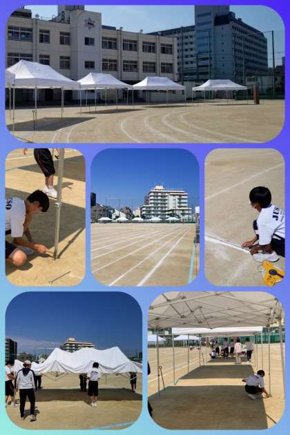 従来の体育大会は実施できませんが、見劣りしない会場づくり、そして教職員の演出、体育委員のリーダーシップ等、前日に全ての準備は整いました。