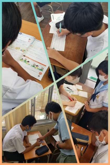 1年3組では、制服と部活動姿の生徒たちが、英語学習に励んでいます。