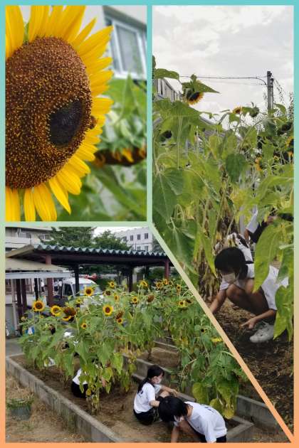 猛暑の中、向日葵の周囲の雑草を取り除いていました。