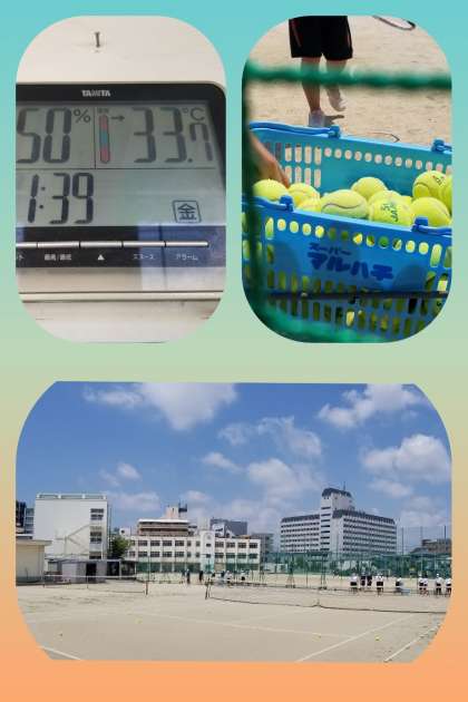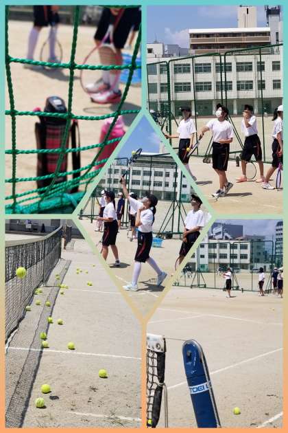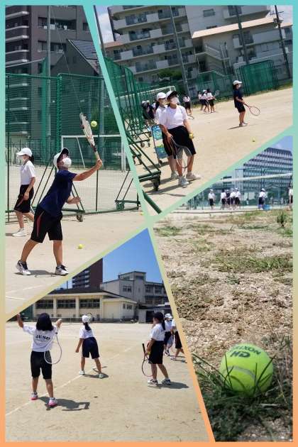 照り返しのきついテニスコート、テニス部生徒たちは、足もとに水筒をおき、いつでも水分補給できるようにしています。