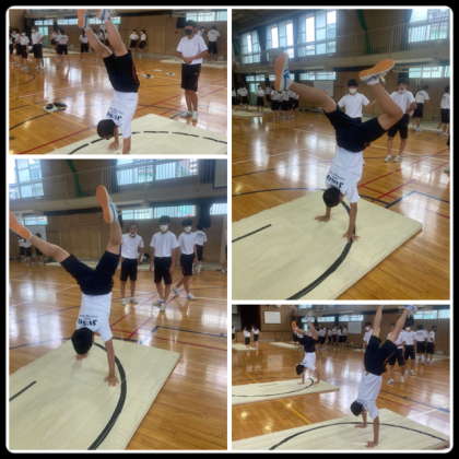 倒立歩行にチャレンジしました。難しい技にもチャレンジする姿勢はさすが3年ですね。1番大切なのは、完成までの過程、どうすればできるようになるのかを考えることが大切ですね。これからもチャレンジ!チャレンジ!