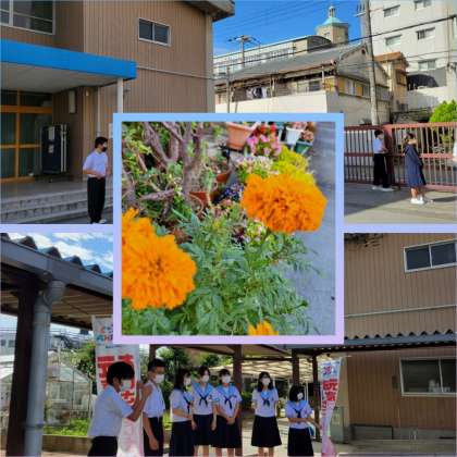校門に爽やかな風とマリゴールドの香りが漂っています。
