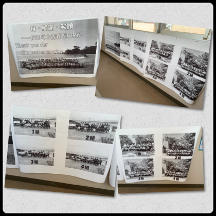 2階渡り廊下に学級記念写真と学年全体写真が飾られました。